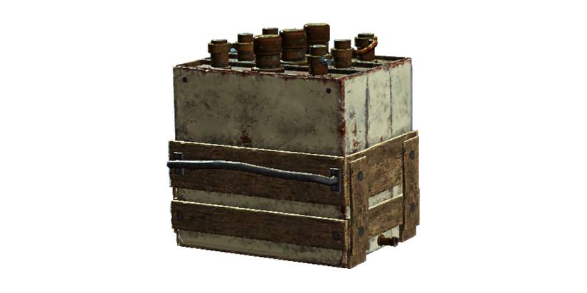 These rusty cubes look more like part of the scenery than an item that can be picked up. One should try not to overlook these brown and boxy objects, however, as they are an excellent source of the component Acid. Big batteries that can yield this component are often found close to workbenches around the world. Although less apparent than Coolant or Abraxo Cleaner that also grant Acid, Makeshift Batteries produce more when broken down.