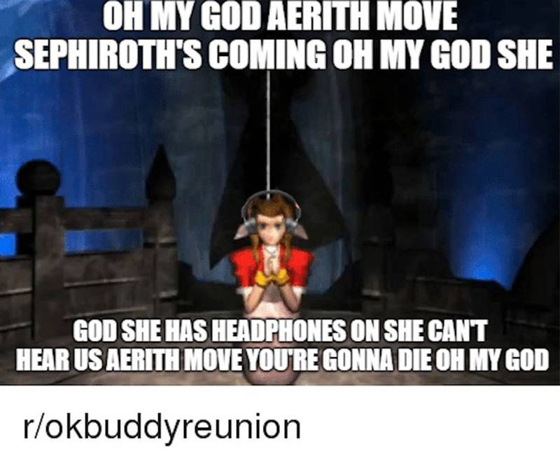 This kind of meme has been used for everything at this point and does a perfect job of explaining one of the most memorable scenes in gaming history. It's not that Sephiroth has the ability to fall from the sky with utmost stealth, Aerith simply forgot to take off her headphones.