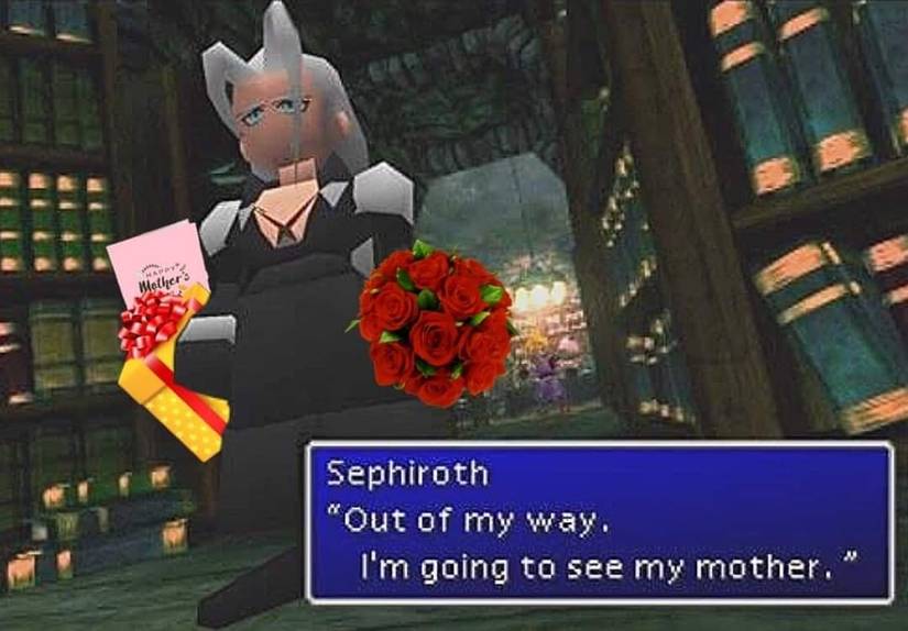Final Fantasy VII memes and Mother's Day are often brought up in the same sentence due to Sephiroth's affiliation with the alien creature, J-E-N-O-V-A. He frequently refers to it as his "mother" due to various story-related reasons, and it's even more common within the Remake.