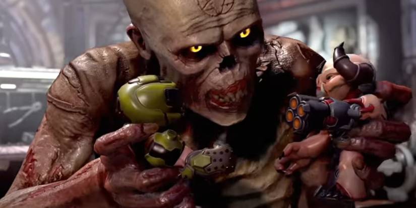 It opens with a demon playing with Doom Slayer's collectible toys, one of them depicting a demon and the other depicting the original appearance of Doomguy. Like a child, he's bashing them together, making sound effects with his mouth, until he hears a familiar shotgun click, and it ends. It's not a deep scene, but it does keep to the silly tone the franchise has shifted to.