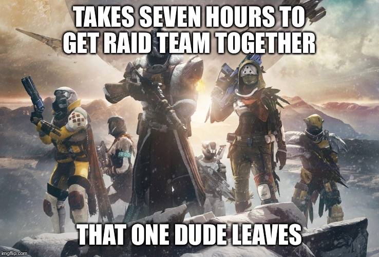 Everyone knows the person we're talking about. You spend seven hours waiting and communicating with your clan or group, trying to gather enough members and complimenting roles to tackle a raid. Everything seems to be going well but right before you jump in, "that person" bails. It's happened to all of us at least once or twice (or maybe we've been unfortunately forced to be "that person"). Whatever the reason or issue, it can put a downright damper on a Raid run. If you're lucky enough to find a replacement that understands the Raid quickly then you're golden, but sometimes you're forced to pull a random, which is like rolling the dice on whether you end up with a helpful teammate that wants to learn or a lone wolf that has "all the answers."
