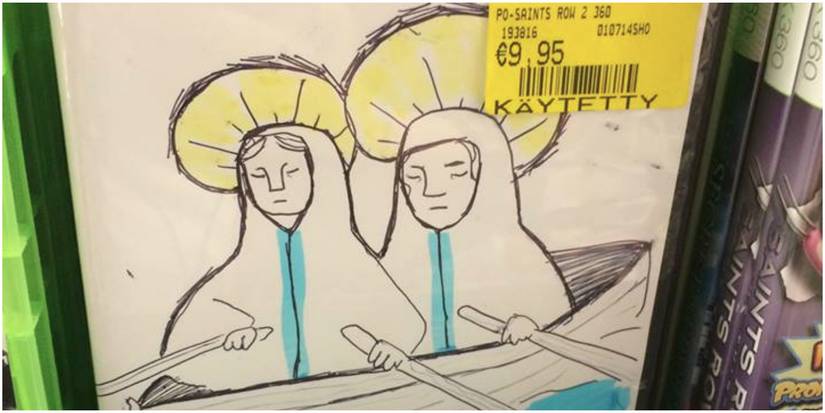 To the non-gamer what does Saint’s Row bring to mind? The title is about a street gang and their territory, or row. Taken quite literally this GameStop Michelangelo depicted two saintly figures rowing a boat.
