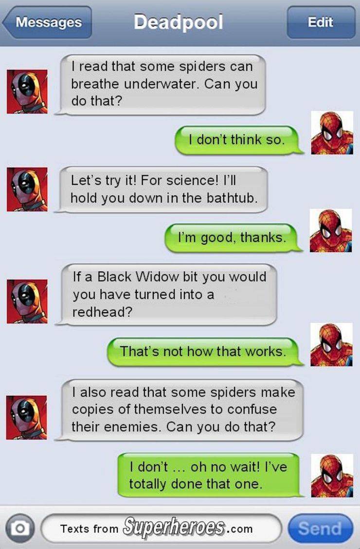It might even work in text format, as some memes suggest, if the movie's creators find a good way to execute it. Imagining poor Spider-Man as he gets notification after notification telling him that Deadpool has sent some asinine message would be great to see.