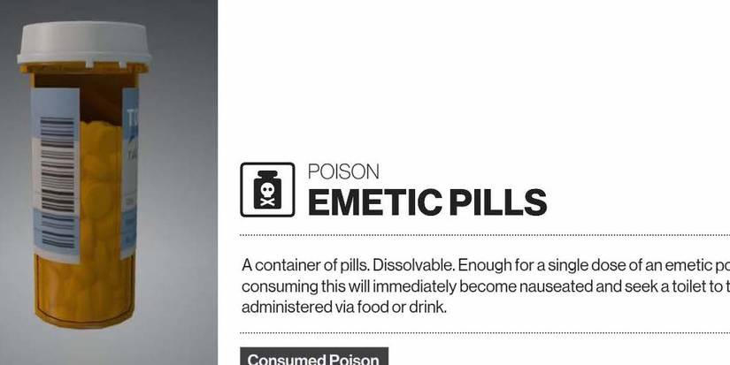 The Emetic Pills are crucial in situations where Agent 47 is not out to kill a certain person. On maps with frequent access to food and food preparation areas, this can be the perfect way to administer a non-lethal dose of poison that causes the mark to throw up. Players can then follow them (or be waiting) in a location in which they can throw up to either kill them or knock them out and hide their bodies. There are a few alternate options that do the same thing, including the Emetic Rat Poison which can be found lurking around most maps.