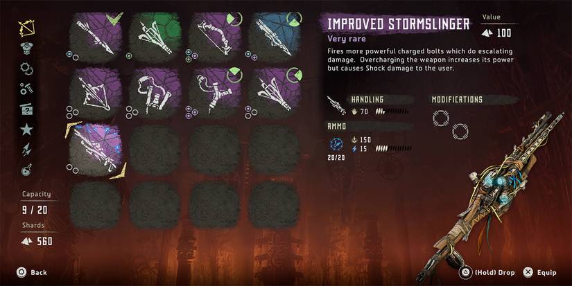 The Improved Stormslinger is a weapon unique to the Frozen Wilds DLC and is immensely powerful. It fires Storm Bolts that deal excellent damage and apply Shock. Up to 20 rounds can be fired before needing to reload. Player’s can overcharge the weapon for greater damage, though doing so will shock Aloy, so use it sparingly.