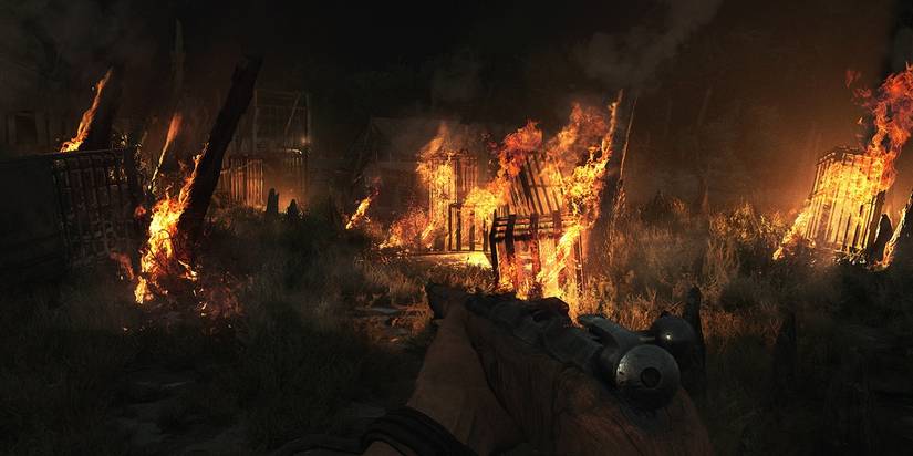 Fire is an effective mechanic in Hunt: Showdown. It appears as oil barrels, lanterns, consumables, and regularly in the environment. If a player is caught on fire, then their health will begin to burn away. If any bar of health is completely burned away, then it is gone for the rest of the game.