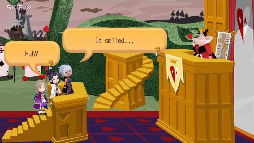 The group manages to find their way to the queen again through the Cheshire Cat, and as they enter her courtroom, they see one of her Card Soldiers getting dragged away to be beheaded. The queen thinks the group returned to honor their sentencing, but she only kills someone once a day, so they'll have to wait for tomorrow. Xehanort and Eraqus inform her that they're actually here to ask her some questions. The queen only allows Eraqus to speak, though, as Xehanort's demeanor upsets her.