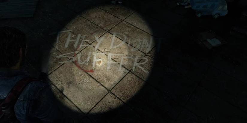 This isn't a cutscene, but a simple event you stumble across while exploring the sewers with Henry and Sam. In one room, you see a deceased man and a group of deceased children shrouded by a white sheet. On the floor are the horrifying words "they didn't suffer." If you explore further, you learn that the man and the children were trapped inside the room while infected pounded on the doors outside, forcing the man to action. This room is sad, yes, but it's also utterly horrifying, as we are left to picture the disgusting events that played out either before or after the man wrote that ominous message. Quite frankly, we don't really WANT to picture it...