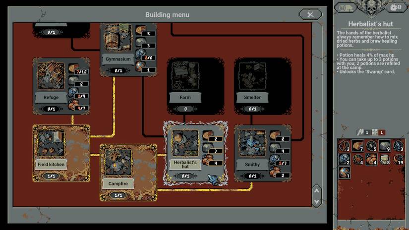Unlike the myriad of RPGs on the market where healing is an opt-in process, in Loop Hero, it will happen automatically if players have potions in their inventory and require some healing. Reaching the end of the loop, marked by the inviting-looking camp tile, will reward the player with two more health potions, as long as they have built the Herbalist's Hut upgrade in their camp.