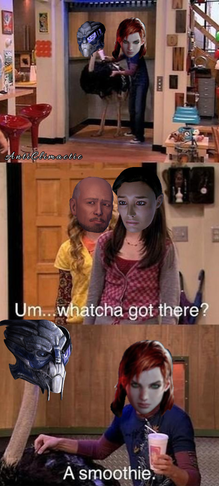 This meme from The Office is popularly used for problematic characters. In this case though, it is a scenario between Shepard and the leader of Omega. The asari, Aria, wants Archangel dead because he is ruining the organized crime. Little does she know that Shepard and Archangel are long-time buddies.