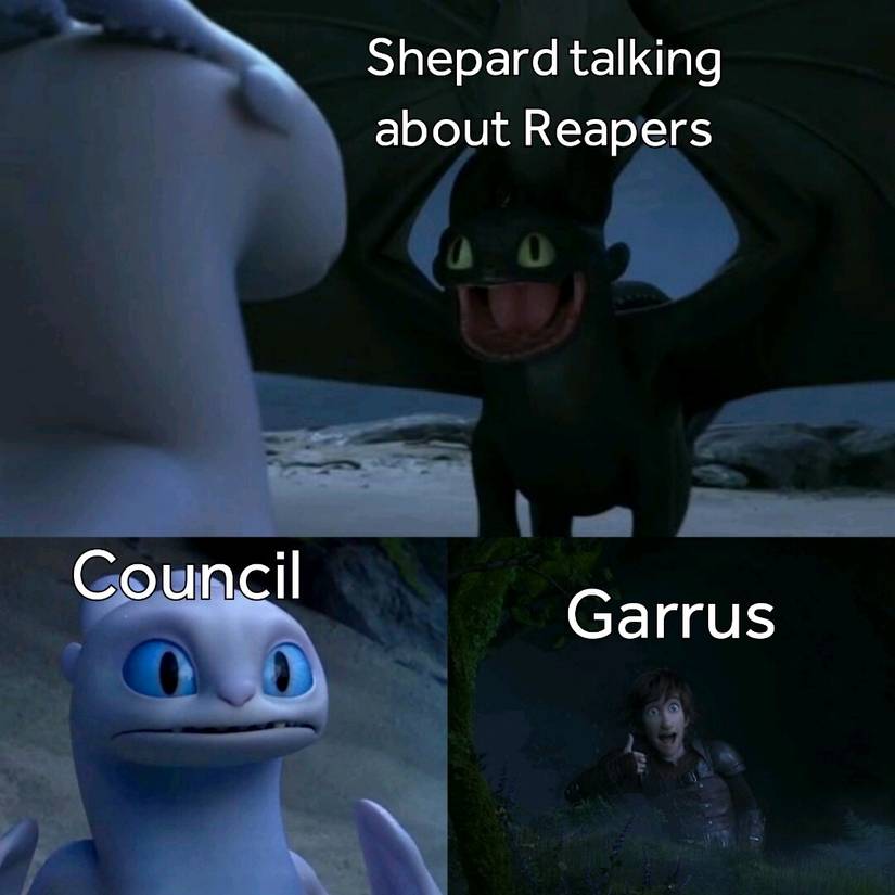 Garrus is one of Shepard's first alien companions in the first game. He used to work for C-Sec and is willing to help Shepard convince the Council of the oncoming Reaper threat. This meme is a goofy interpretation of what happened.