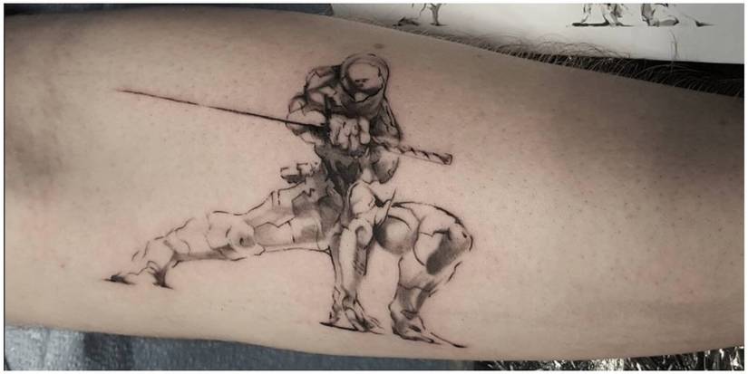 Gray Fox appears in Metal Gear Solid and takes part in the Shadow Moses Incident, where he dies. This tattoo is a good way for fans of the sword-wielding ninja to remember him.