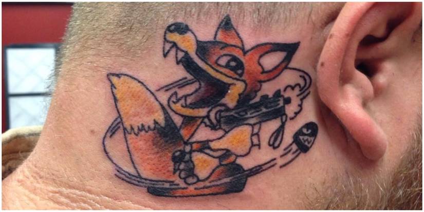 The FOXHOUND unit in Metal Gear Solid had two logos -- the one of the fox with a knife in its mouth and one of a cartoon fox. The cartoon fox logo was used in the 1990s but then replaced with the modern logo. This tattoo was done by @derekolivertattooing on Instagram and would be perfect for any fan of FOXHOUND.