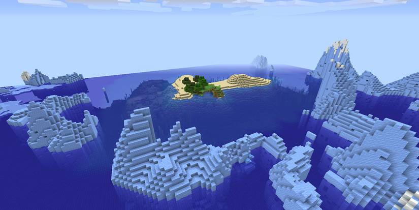 If you're looking to start a world somewhere icy and cold, this seed is definitely one to load up. It features a huge cluster of frozen, icy islands near your spawn point. In the center of them, there's a sunken island of sand and grass. Although it may look out of place, it's a really unique part of this world and is definitely something that will draw in a lot of players.