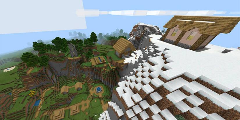 This seed, -772124751310384583, spawns the player in a really unique area. The player finds themselves at the top of a really snowy mountain that has green grass and a large forest just below it. Although this is pretty ordinary for Minecraft, the thing that actually sets it apart from other seeds is the fact that there's a village right here.
