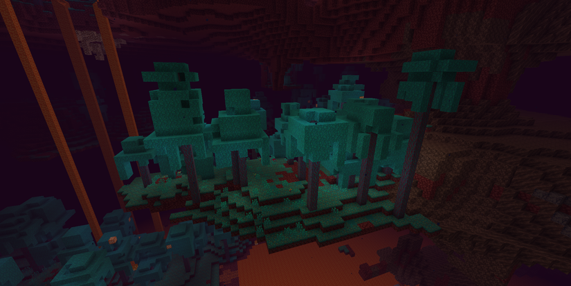 The Nether has had one biome for the entirety of its lifespan, which for players, became boring to look at even with all the chaos that the dimension brings. This will change in 1.16, with four new biomes taking over the Nether landscape. There's the crimson forest, the new biome that generates most frequently, which grows crimson fungi that the player can chop down for wood in the Nether. These biomes also serve as the main stomping grounds of two of the Nether's new mobs, Piglins and Hoglins. There are also warped forests, a more peaceful Nether biome that also provides a dense, blue aura and plenty of blue fungi trees.