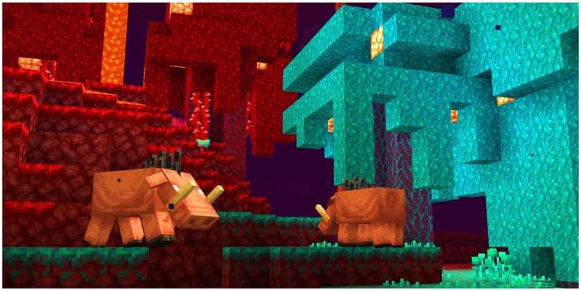 Other additions include biomes for The Nether, such as soul sand valleys, warped forests, and Nether wastes. New mobs also include Striders, which the player can use to ride across pools of lava, and Zoglins, which will attack the player on sight.