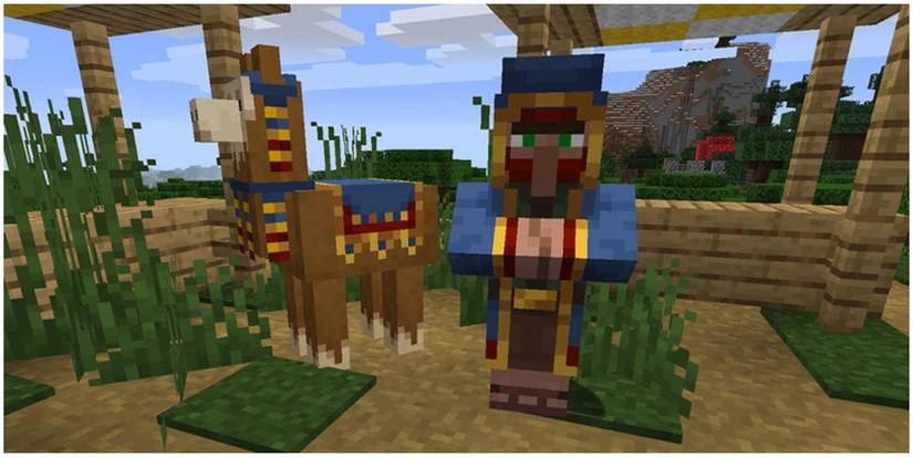 The Village and Pillage update adds a lot of new blocks and mob types. The wandering trader can be found inside of villages, trading emeralds for items around the game's world. Also included are cats, which can be tamed and brought back to the player's home.