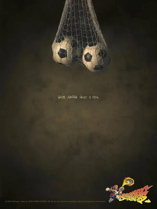 Tucked away in the bottom corner of the ad in question is the Super Mario Strikers logo, with the text "You're gunna need a pair" featured square in the middle. Two soccer balls hang in a net above the text and make it pretty clear what, exactly, Nintendo thinks players need a pair of in order to play Mario Strikers. While the soccer title is often considered one of the better Mario sports game ideas, this advert for it was maybe better left on the drawing board.