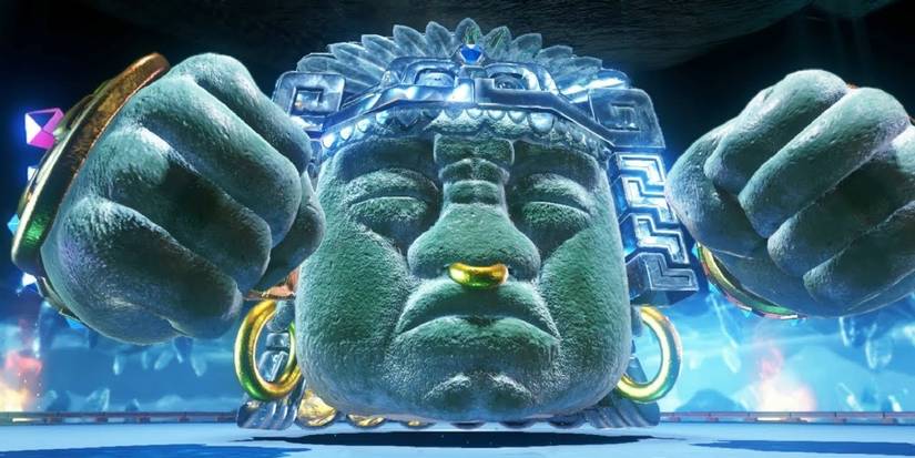 While in the Sand Kingdom in Super Mario Odyssey, players may come across what looks like a glass pyramid. After falling underground later in the level, they will find out that this was the head of Knucklotec. Based off of Olmec civilization sculpted heads, this boss uses his hands to try to smash Mario.