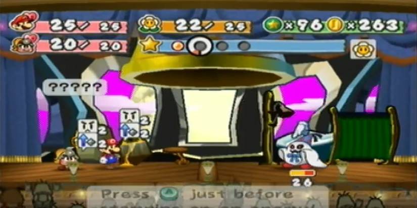 This ghost is stronger than the Boos in his mansion when you fight him. After Vivian chooses to help Mario, who has had his body stolen, the fight becomes interesting. Your best bet is to fight Doopliss himself. Don’t worry about your partners. Goombella is very easy to counter. Doopliss is also using Mario’s moves, so timing is very similar, with the hardest thing being the hammer that you’ll have to counter.