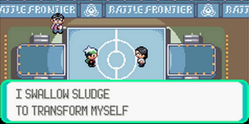 It seems the Battle Frontier in Pokémon Ruby & Emerald brings a lot of weirdos out of the woodwork. This strange NPC declares that he “swallows sludge to transform” himself. Sludge is a poison based move used by a handful of Pokémon like Grimer and Swalot.