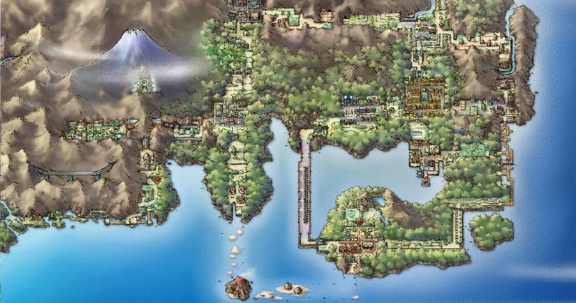 The Hoenn Region made its debut in Pokemon Ruby and Sapphire. It’s located south of the Sinnoh Region and features a main island surrounded by numerous small islands that vary in size and shape. All the city names are compound words like Mossdeep, Lavaridge, and Littleroot- the latter of which is the base town where Professor Birch lives. The Hoenn starters are Treecko, Torchic, and Mudkip.