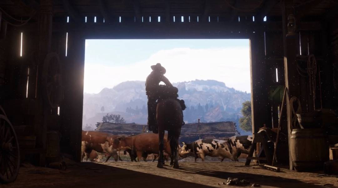 The scene in the trailer and the shot in the film use a dimly lit barn as a foreground and let the bright Western atmosphere pour in. In Red Dead Redemption 2’s case, however, the shot also features some passing cattle and a cowboy (or rancher) mounting a horse. Some have speculated this could be the (or one of the) main character in the game, but Rockstar is tight lipped about story details right now.