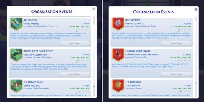 To join an organization, you can check when the group you're interested in is meeting next time. The information is in the same tab as regular clubs. Both schools have their own three unique organizations. Once an event starts, you can click on the "Go to Event" button, which will send your Sim to the location automatically.