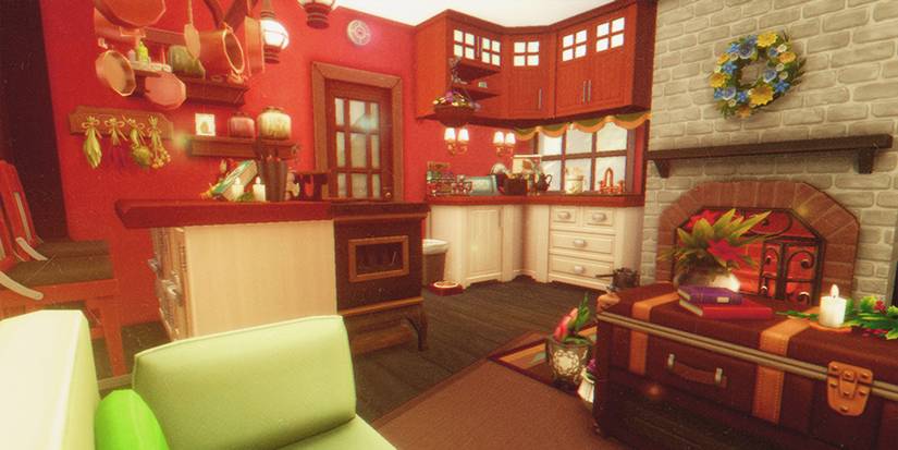 This Sims 4 house is one that fits in with the aesthetic of Glimmerbrook perfectly. This house has a red exterior that looks great among all the trees and foliage in Glimmerbrook and the outside of the house is perfectly landscaped. Inside, it has one bedroom and one bathroom.