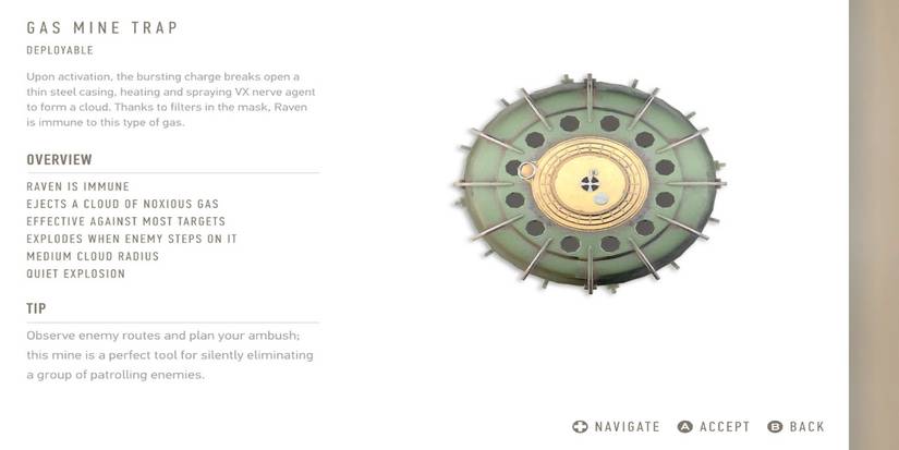 For those who want a plantable explosive like the aforementioned C-4 but don't want something loud, then the Gas Mine Trap is a great alternative. The explosive won't be able to take out vehicles like the C-4, but it can help eliminate pesky enemy patrols. Many enemies in the game walk along set pathways, so with a bit of patience, the player can work out the perfect spot to hide the trap.