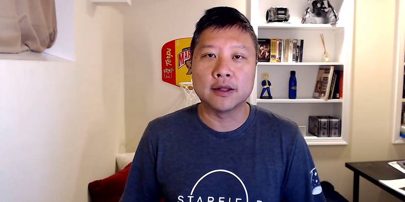 Now it seems that the developer has confirmed that the images are indeed authentic, though in an indirect and discreet way. Eagle-eyed users on Reddit noticed that the logo of a t-shirt worn by a Bethesda employee during Howard’s Develop: Brighton presentation matched the logo worn by the astronaut in one of the leaked images. The employee in question is Ashley Cheng, managing director at Bethesda Game Studios. During the presentation, Cheng made a brief appearance from a video call, in which he wore a t-shirt with an official Starfield logo on the front, and a more discreet logo located on the arm.