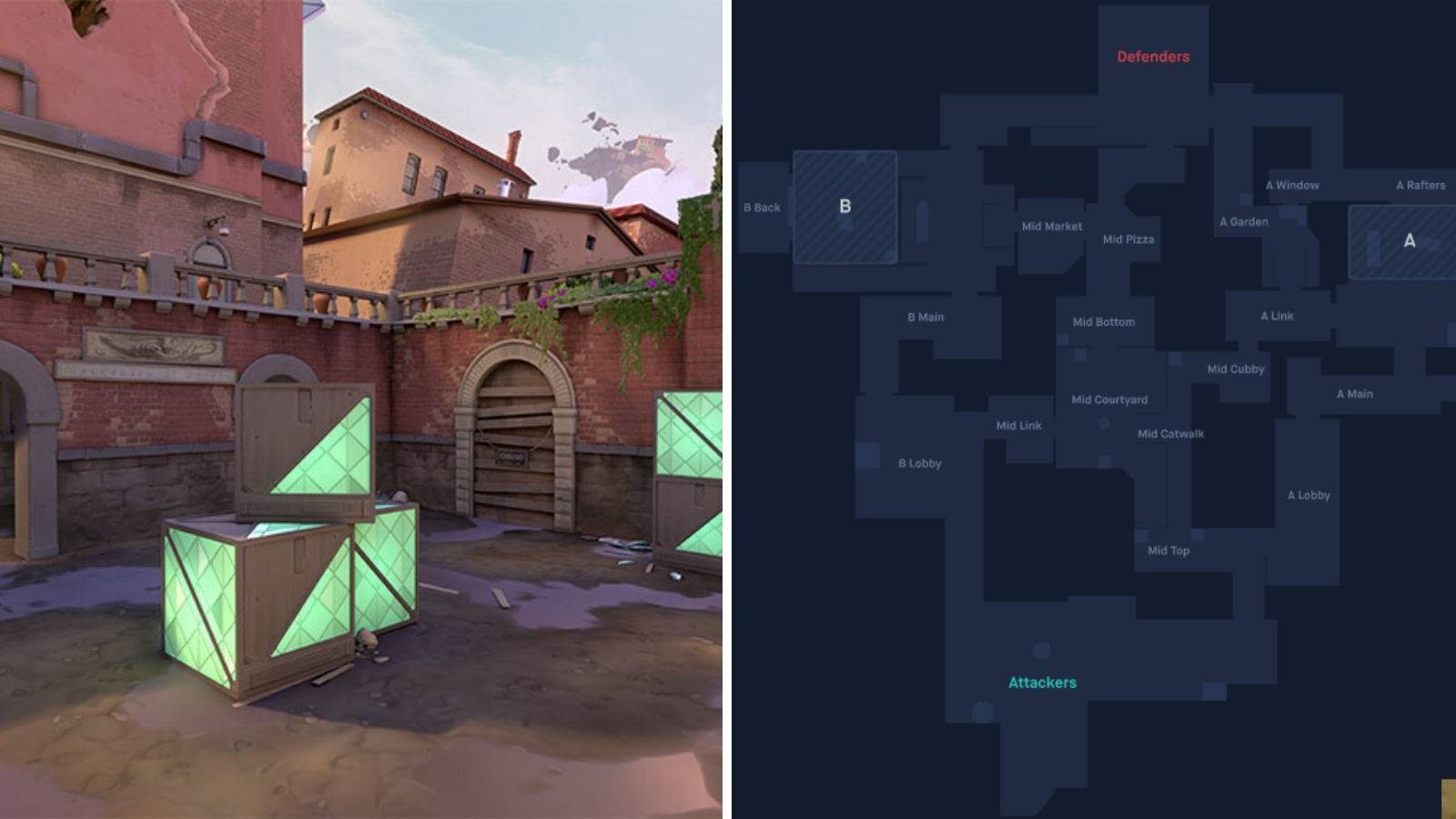 The main objective while holding B is getting control of the B Main. Agents such as Cypher and Sage really shine here as either of them can choke the B main with their utilities. Blocking B Main will allow players from Mid and Catwalk to rotate and backstab the opposing players. It’s very hard to attack B, so one Agent is usually enough to hold the sight. Delaying the enemy push waiting for reinforcements is the way to go while holding B site.