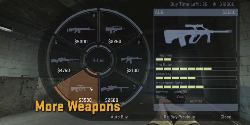 CS: GO retains the classic Buy Menu, this time making weapon types and accessories more recognizable and more accessible. Players can see hotkeys on all items, forcing them to memorize their favorite combinations quickly or get left behind on a match.