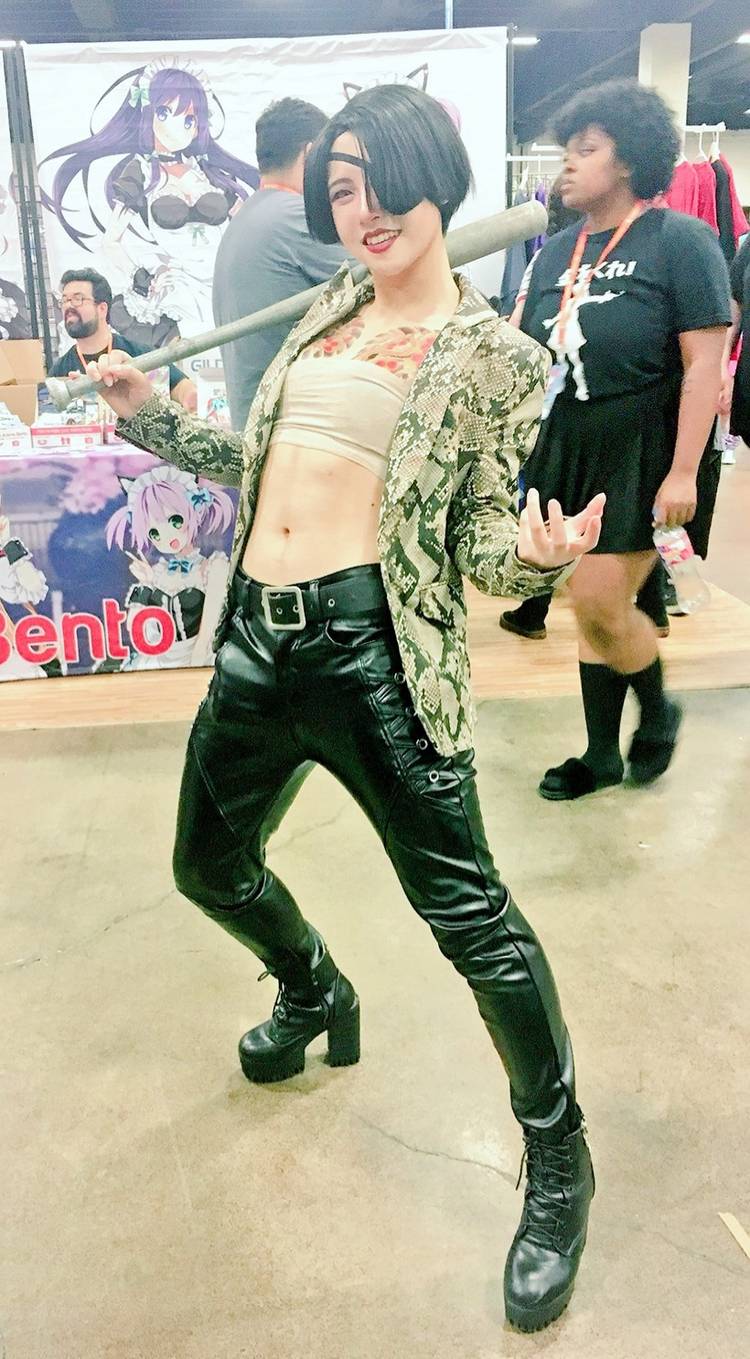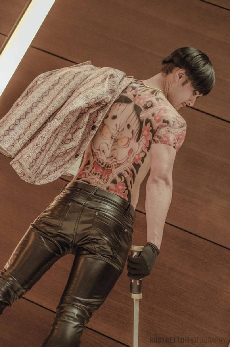 This cosplay by kisatamura is great, showcasing Majima's go-to outfit of leather pants and snakeskin jacket combo. The details here are phenomenal, such as the tattoo being spot on, the gold chain necklace, and even Majima's tanto knife.
