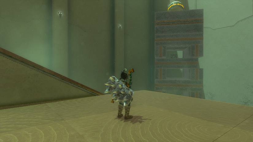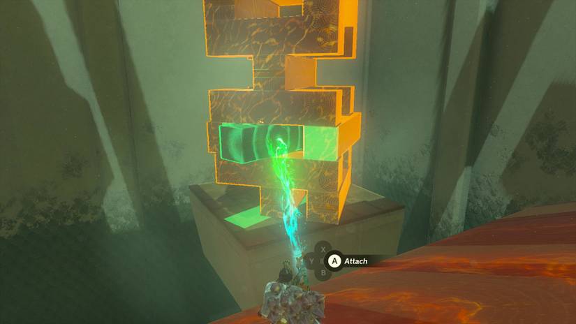 The player should descend a ramp situated in front of it to give appropriate range to handle the blocks with the Ultrahand. As tempting as it may be, the player should not jump and glide to land on either the tower or its platform. Doing so will trigger the opening of the bottom platform, plunging Link and the puzzle pieces into the abyss below. Both Link and the puzzle will respawn, and the tower puzzle will reset entirely.