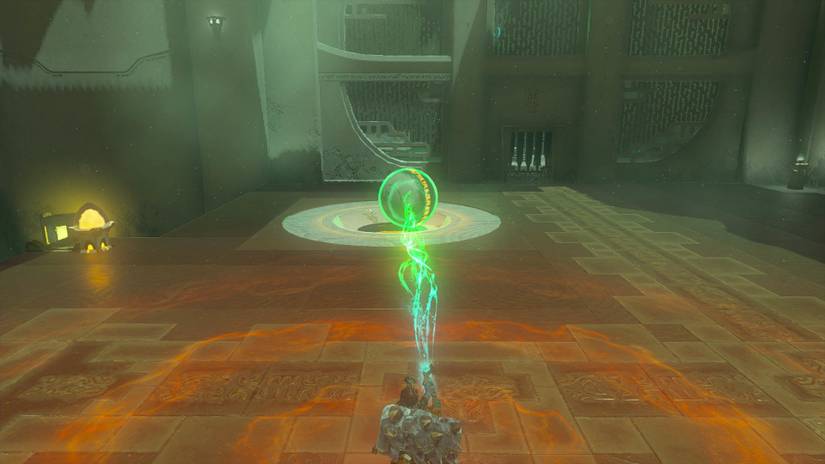 Bring the ball back to the main room using Ultrahand, then drop it in the large hole in the floor. This will solve the puzzle to opening the gate leading to the exit of the shrine.